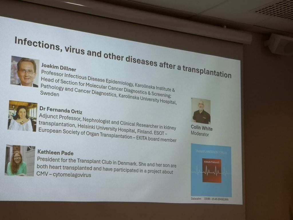 Colin White från Irland och professor Joakim Dillner talade om infektioner, virus och andra sjukdomar efter transplantationen. 13% av cancersjukdomar beror på infektioner. Risken för cancer ökar hos transplanterade patienter. Papillomavirus orsakar cancer. 3,5 % vanligare hos transplanterade. Stor ökning av icke melanom hudcancer. HPV-vaccin hjälper före sjukdomen men inte som terapi. Idag lever transplanterade patienter längre och får därför fler sjukdomar. Det är högre risk att bli diabetiker efter njurtransplantation. Det behövs ny medicin för att hindra komplikationer. Patienter behöver bättre uppföljning och eftervård. I Finland har man en mer holistisk syn på vården än i Sverige.